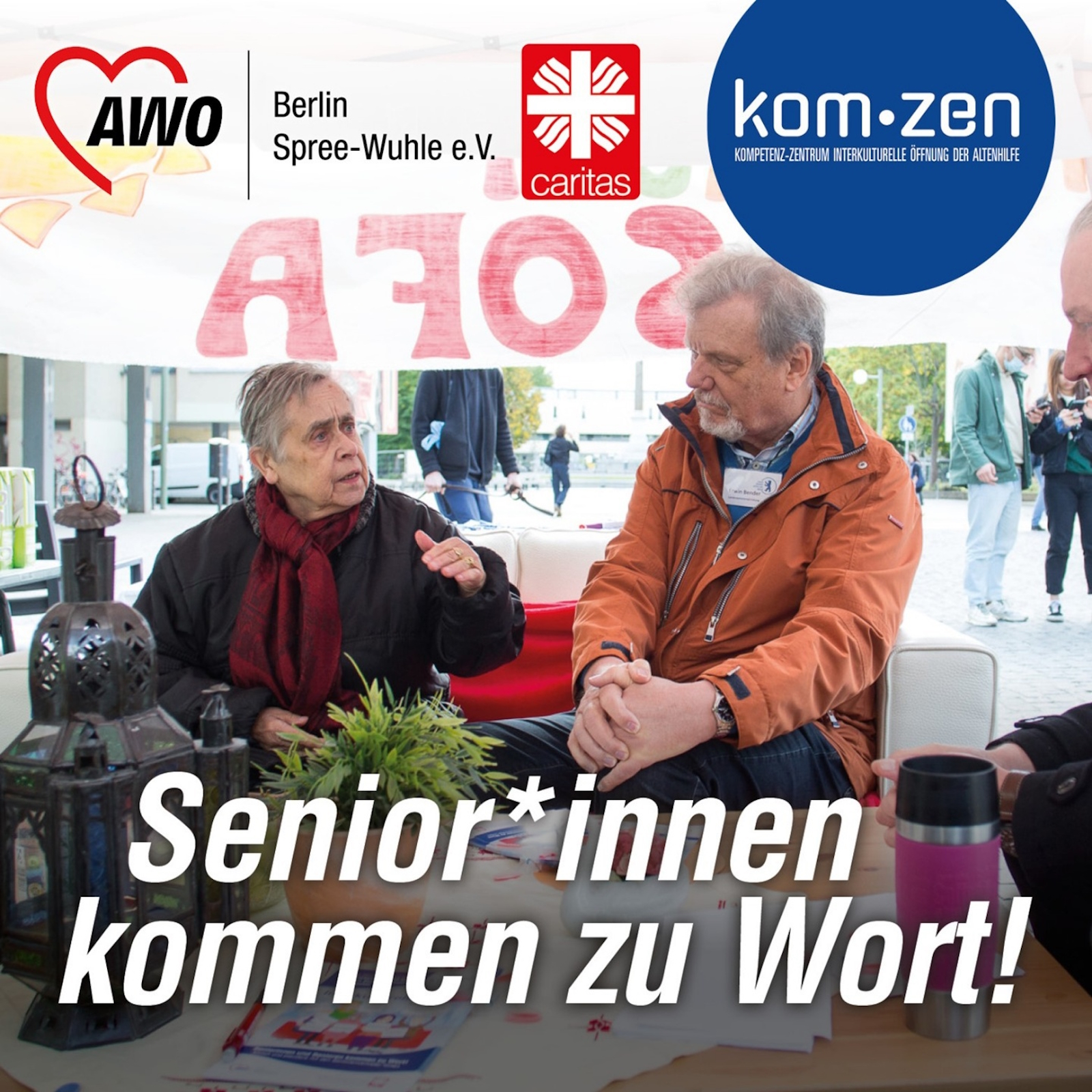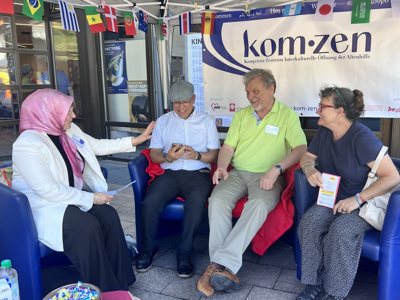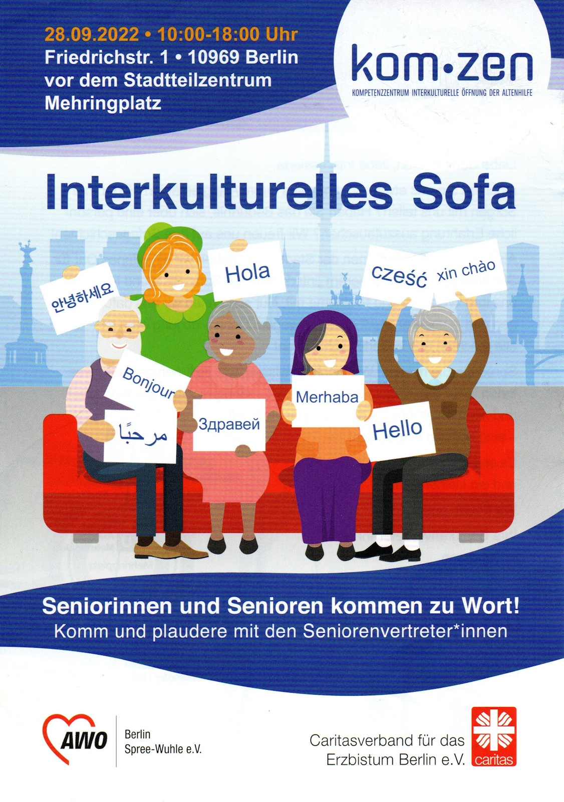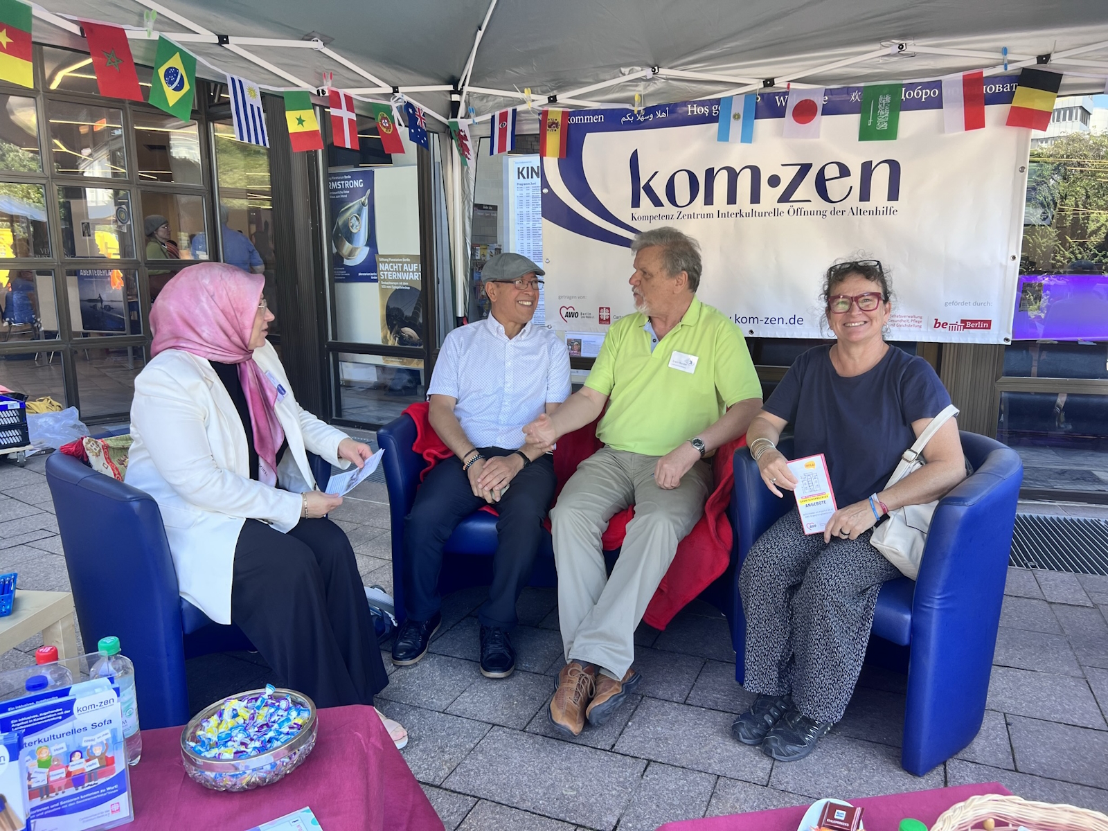 Im Herbst 2022 erlebte das Interkulturelle Sofa seine Premiere auf dem Mehringplatz in Kreuzberg. Das ist eine mobiles Angebot des kom-zen Kompetenzzentrum Interkulturelle Öffnung der Altenhilfe und der Berliner Seniorenvertretungen. Das wandernde Wohnzimmer möchte älteren Menschen in Berlin die Möglichkeit zum Austausch sowohl untereinander und als auch mit den seniorenpolitischen Gremien bieten.