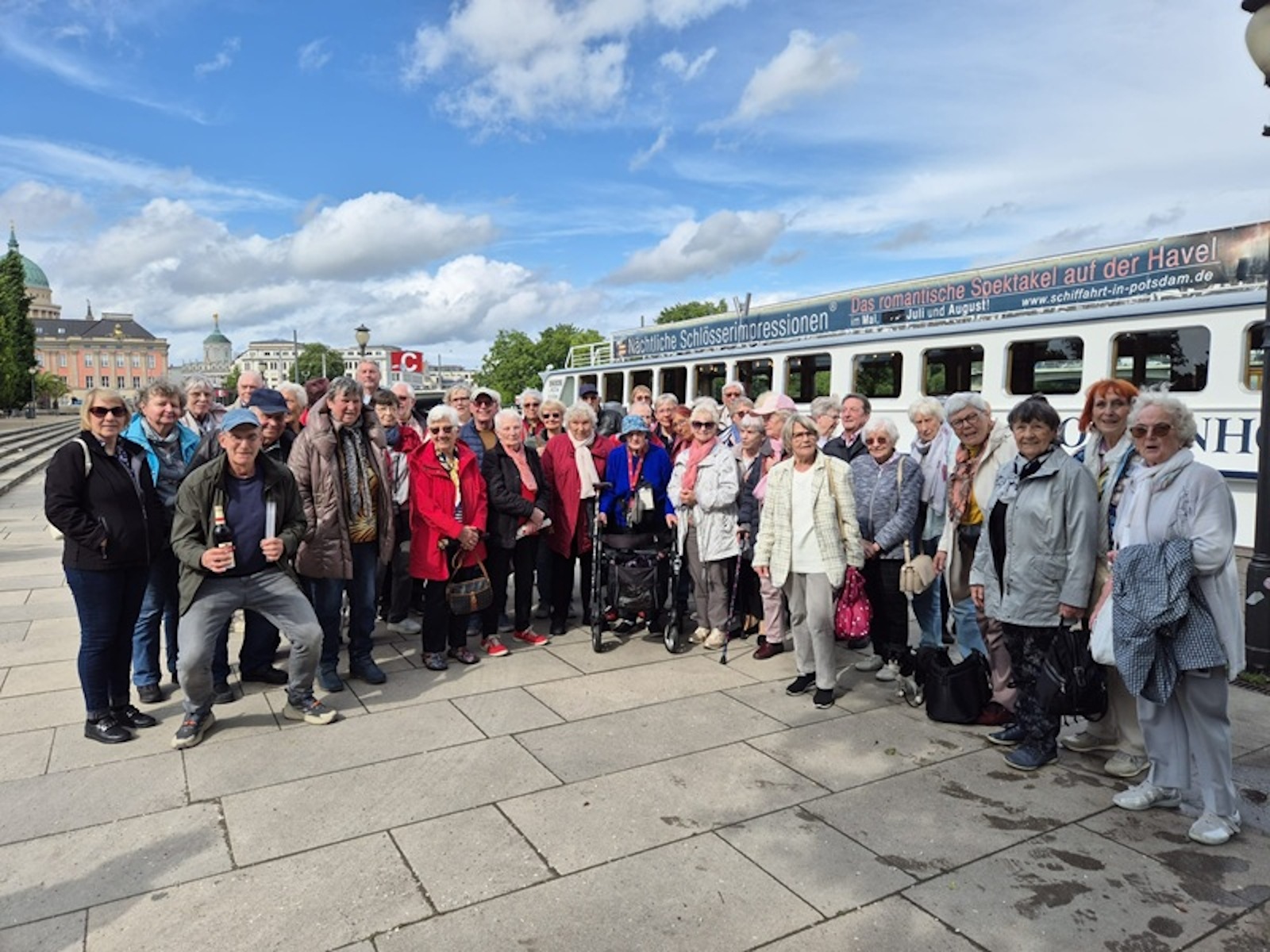 Nach dieser großen Potsdam-Rundfahrt ging es zum Hafen an der Langen Brücke, wo unser Salonschiff zur Schlösser-Rundfahrt uns schon erwartete. Bei strahlendem Sonnenschein erkundeten wir jetzt Potsdam und Umgebung vom Wasser aus.