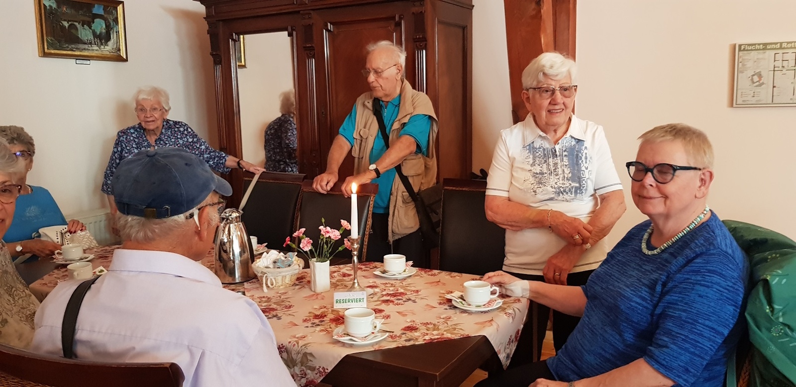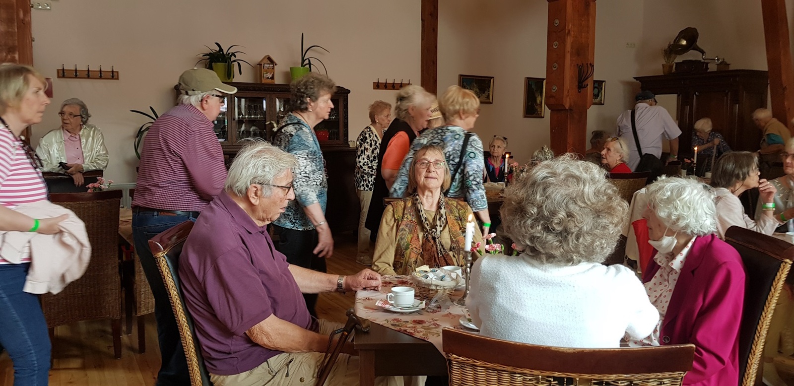Weiter ging die Busreise über Brandenburg an der Havel nach Lehnin, wo das berühmte Zisterzienserkloster besucht wurde. Über Klaistow, Fichtenwalde und Beelitz Heilstätten führte die Reise durch das Beelitzer Spargelanbaugebiet weiter zum zweiten Ziel des Ausflugs, den Jakobshof in Beelitz OT Schäpe. Dort wurde die Gruppe mit einem großen Stück frischem Obstkuchen und Kaffee verwöhnt und es gab Gelegenheit für einen kleinen Spaziergang.