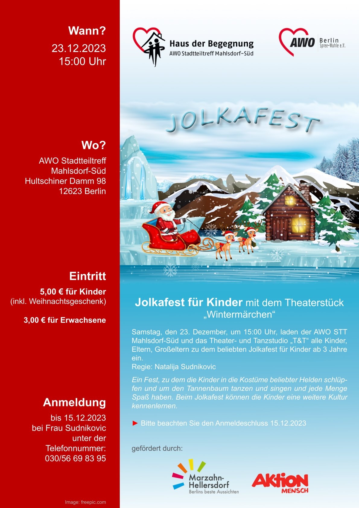 Im „Haus der Begegnung“ AWO-Stadtteiltreff Mahlsdorf-Süd fand am 23. Dezember 2023 zum zweiten Mal ein Jolkafest für Kinder ab 3 Jahren und deren Familien statt.