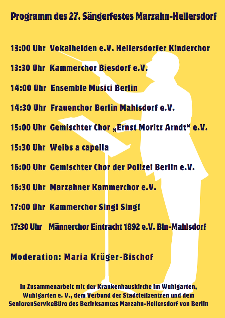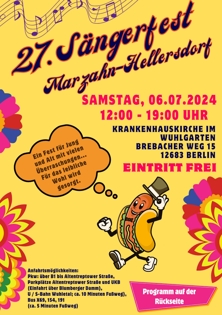 Das 27. Sängerfest Marzahn-Hellersdorf findet am 6. Juli 2024 statt. Dieses jährliche Highlight, das die Vielfalt der Chormusik von Generation zu Generation feiert, wird zwischen 13:00 und 19:00 Uhr in der atmosphärischen Krankenhauskirche im Wuhlgarten, Brebacher Weg 51, 12683 Berlin, veranstaltet.