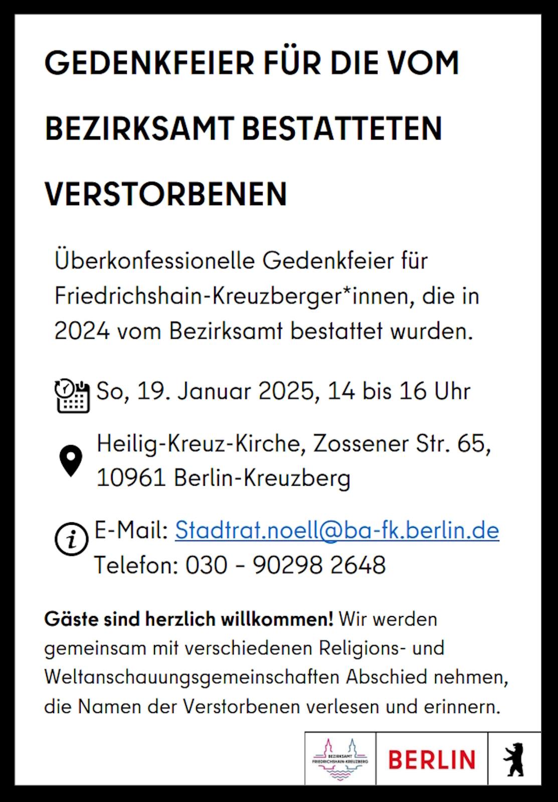 Alljährlich im Januar lädt der Bezirk Friedrichshain-Kreuzberg zu einer überkonfessionellen Gedenkfeier für die Menschen, die vom Bezirksamt bestattet wurden, ein. Gemeinsam mit verschiedenen Religions- und Weltanschauungsgemeinschaften wird ein würdevoller Abschied gestaltet und während der Feier werden die Namen aller Verstorbenen vorgelesen und für jede*n eine Kerze angezündet.