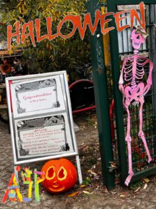 die traditionelle Halloween Party auf dem ASP mit Feuerskulptur und Parade durch den Kiez