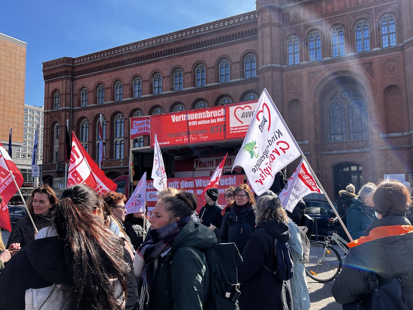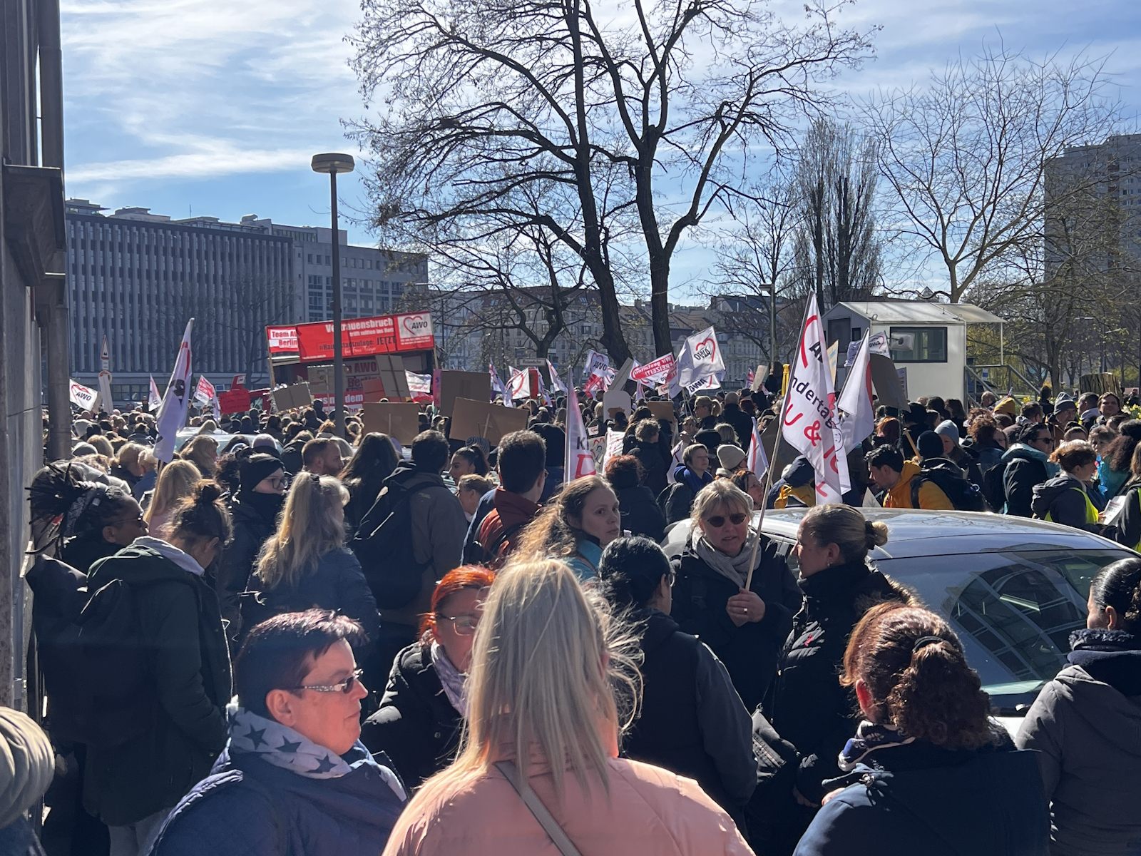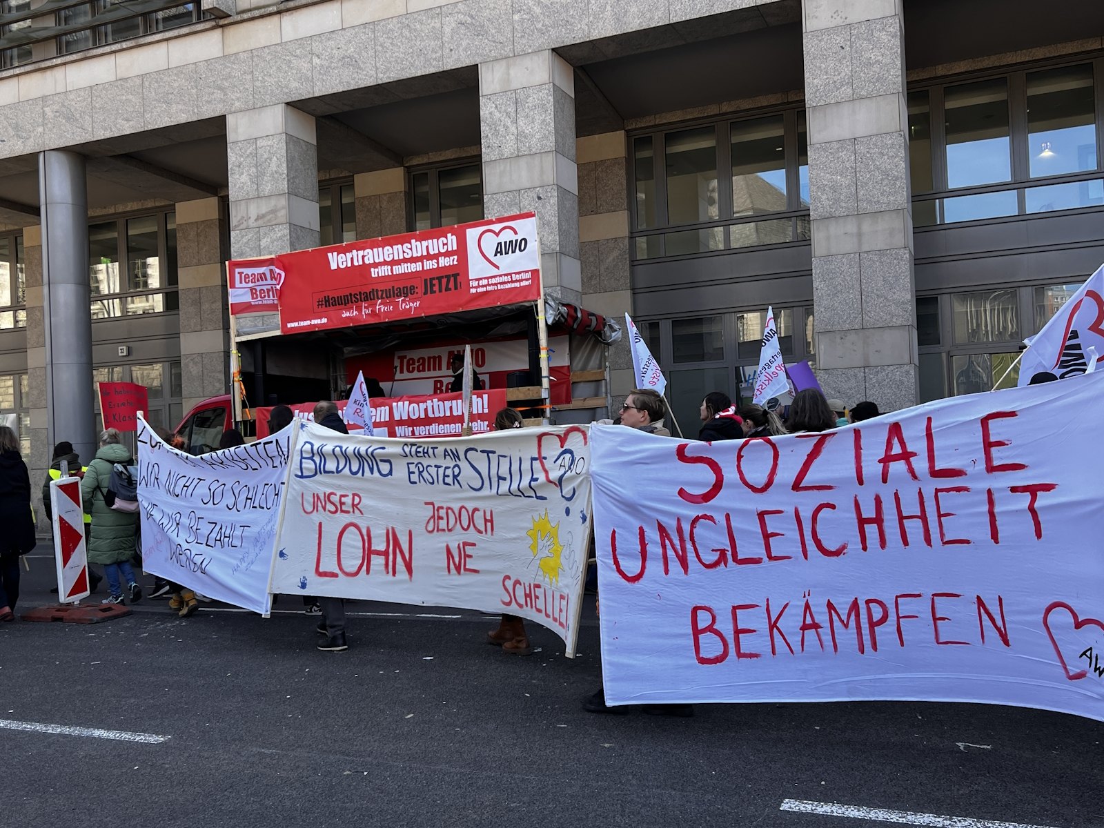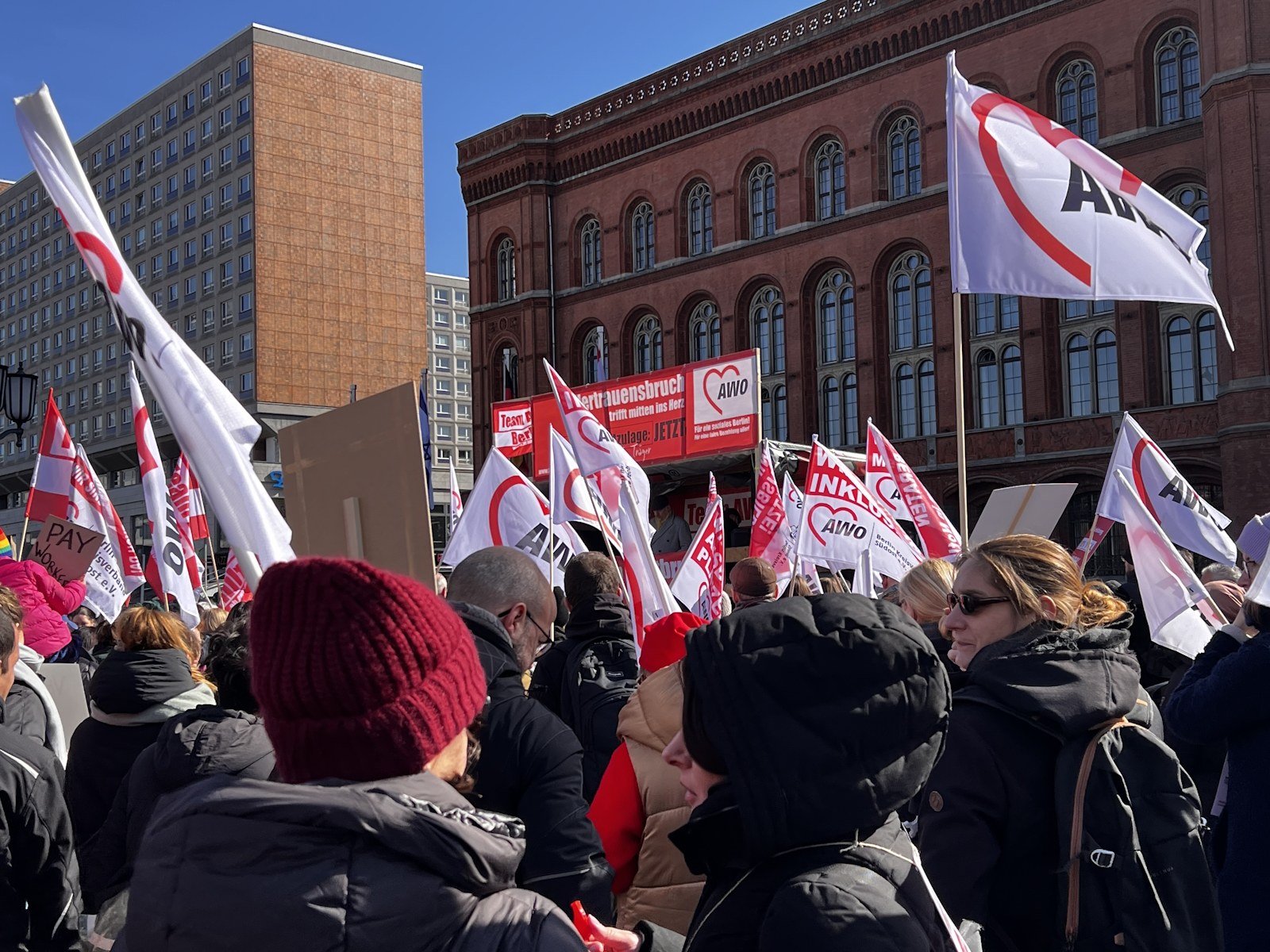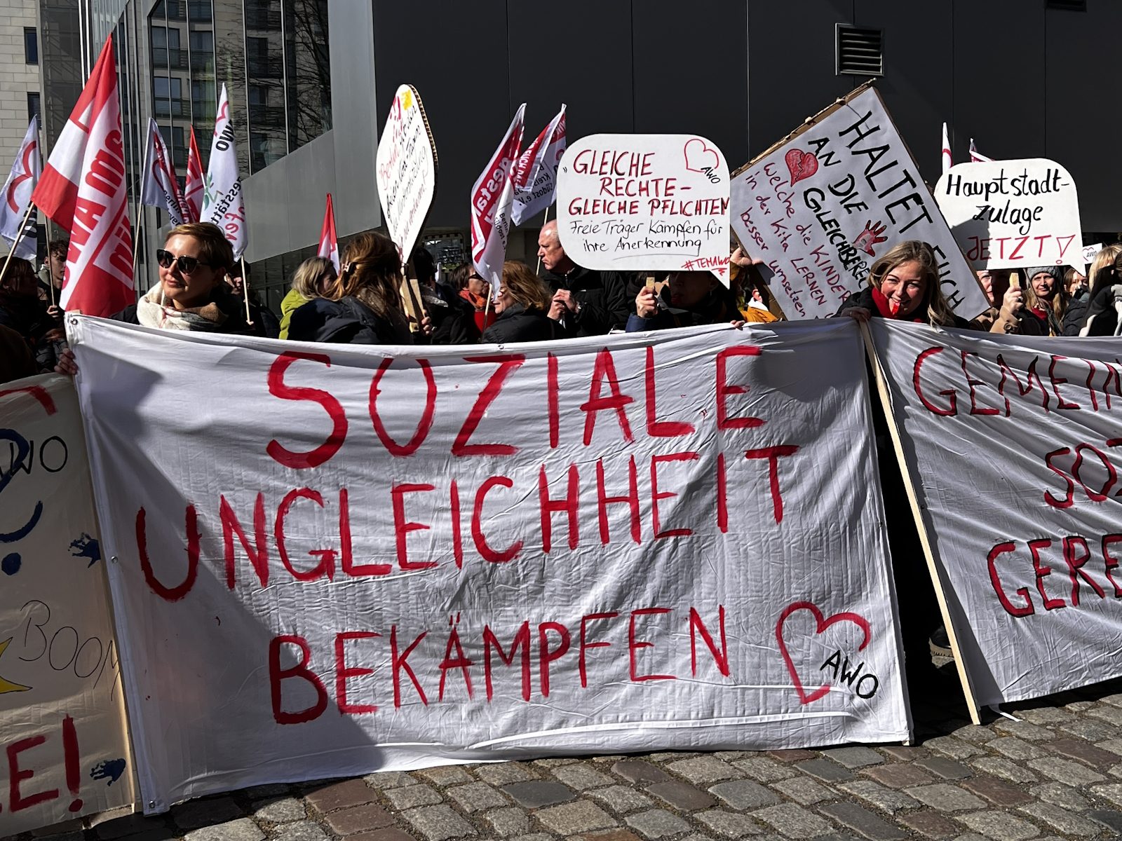 Nachdem bereits im Herbst vergangenen Jahres und am 7. März dafür demonstriert wurde, waren am 18. und 19. März 2024 die Einrichtungen der Berliner AWO, darunter u. a. Kitas, Beratungsstellen und Seniorenangebote geschlossen. Am 19. März protestierte die AWO mit einer Demonstration vor dem Roten Rathaus und der Senatsverwaltung für Finanzen gegen die Ungleichbehandlung der Mitarbeiter*innen freier Träger im Vergleich zu Landesbeschäftigten, insbesondere bei der Hauptstadtzulage.