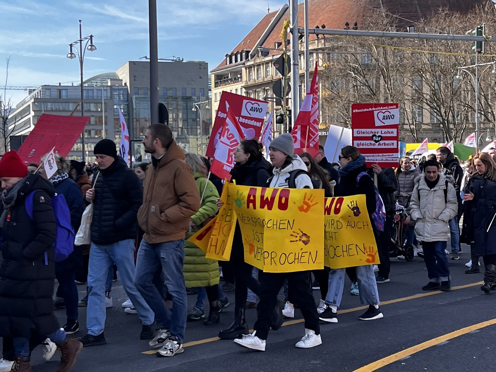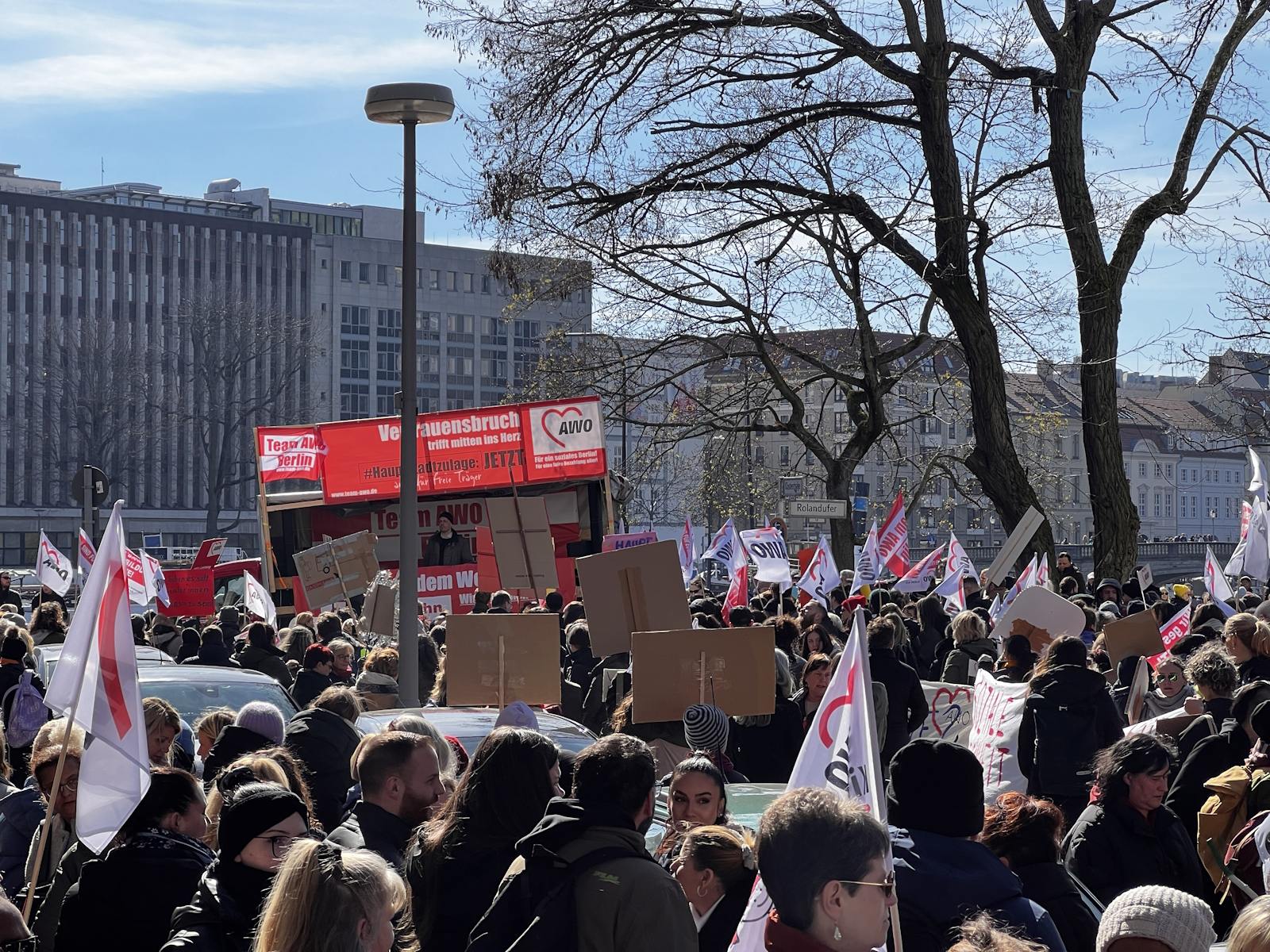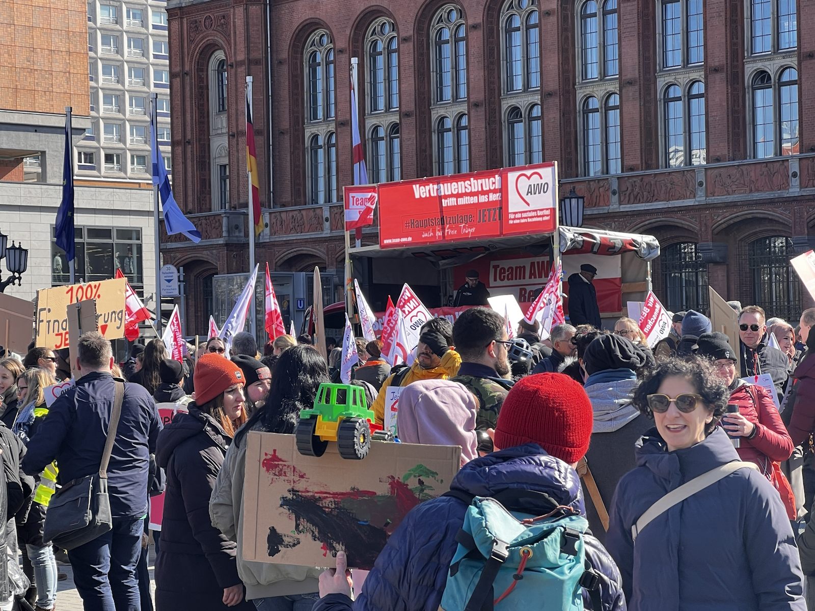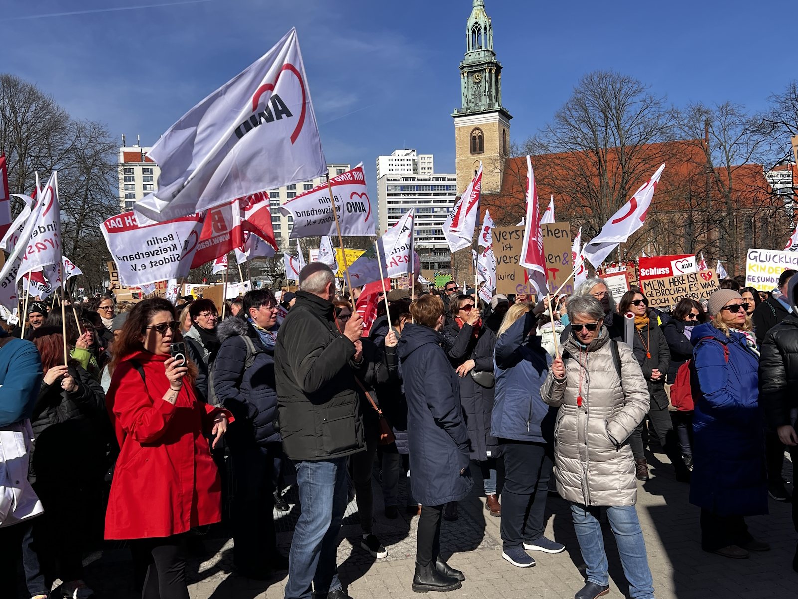Nachdem bereits im Herbst vergangenen Jahres und am 7. März dafür demonstriert wurde, waren am 18. und 19. März 2024 die Einrichtungen der Berliner AWO, darunter u. a. Kitas, Beratungsstellen und Seniorenangebote geschlossen. Am 19. März protestierte die AWO mit einer Demonstration vor dem Roten Rathaus und der Senatsverwaltung für Finanzen gegen die Ungleichbehandlung der Mitarbeiter*innen freier Träger im Vergleich zu Landesbeschäftigten, insbesondere bei der Hauptstadtzulage.