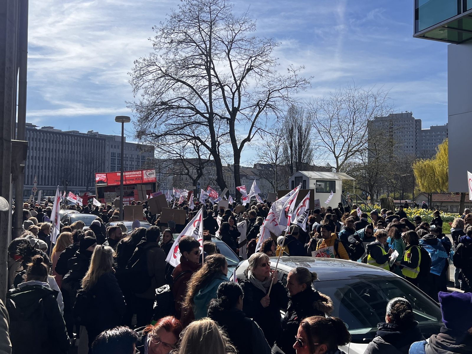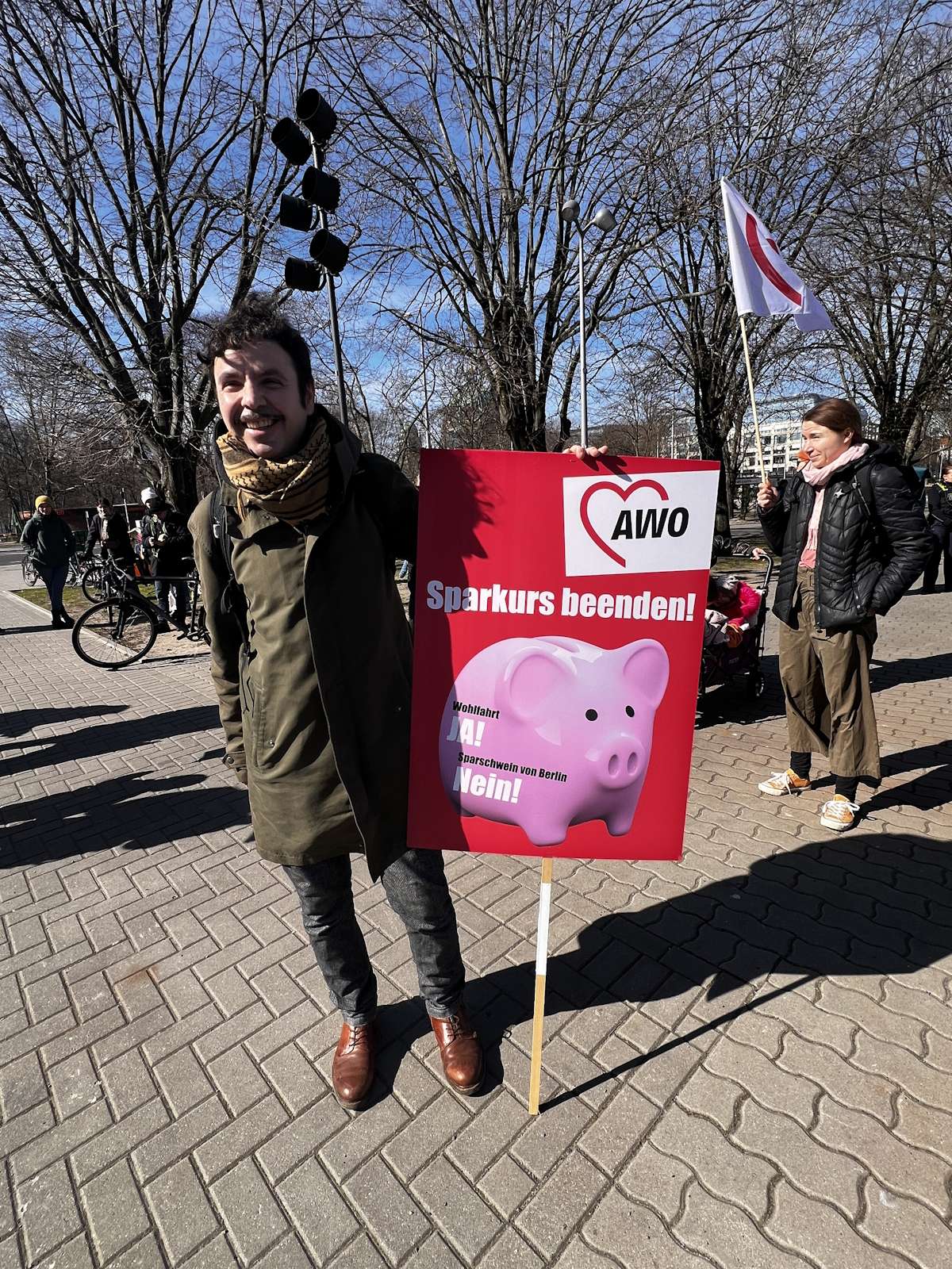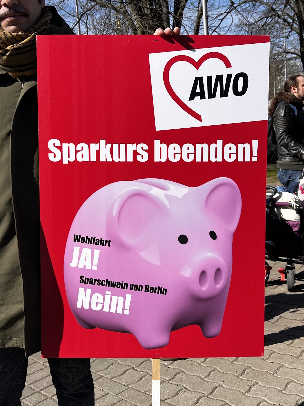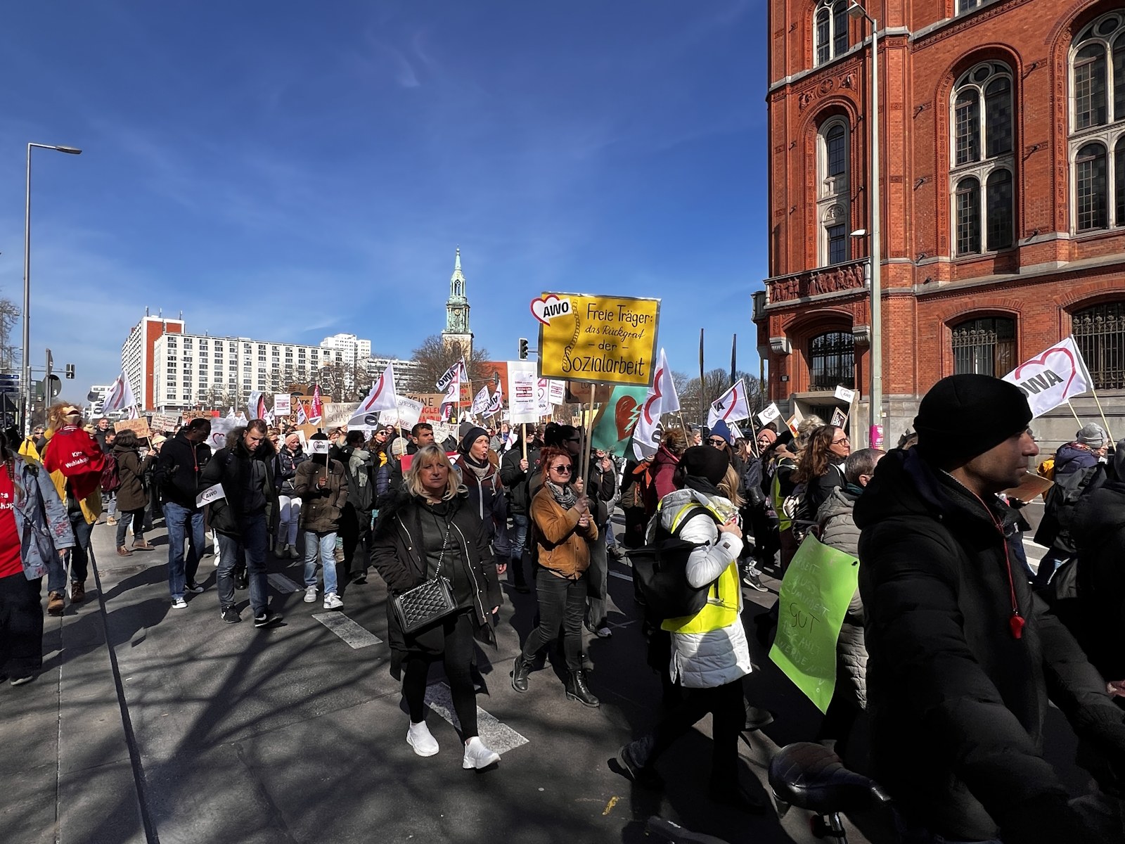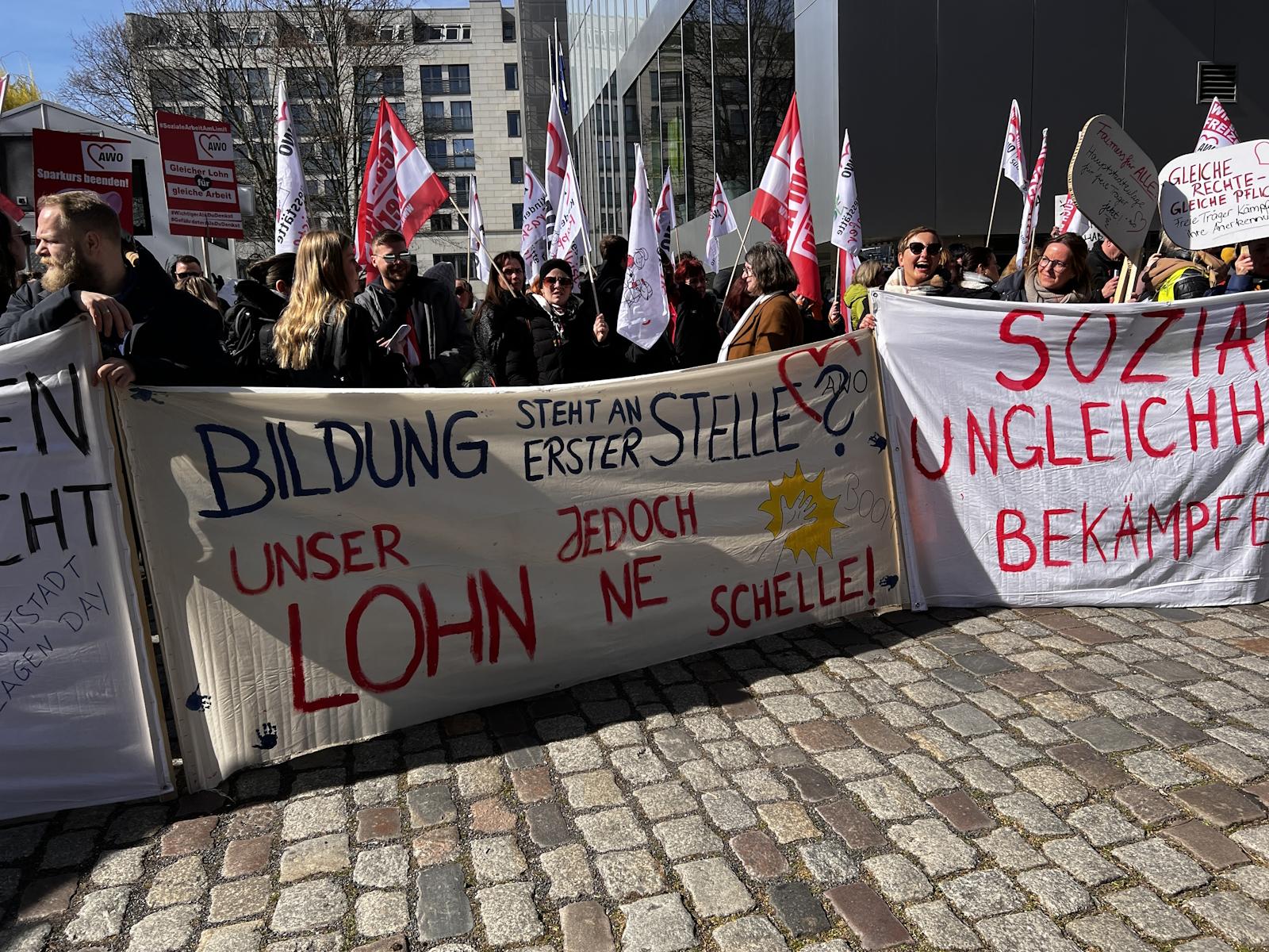 Nachdem bereits im Herbst vergangenen Jahres und am 7. März dafür demonstriert wurde, waren am 18. und 19. März 2024 die Einrichtungen der Berliner AWO, darunter u. a. Kitas, Beratungsstellen und Seniorenangebote geschlossen. Am 19. März protestierte die AWO mit einer Demonstration vor dem Roten Rathaus und der Senatsverwaltung für Finanzen gegen die Ungleichbehandlung der Mitarbeiter*innen freier Träger im Vergleich zu Landesbeschäftigten, insbesondere bei der Hauptstadtzulage.