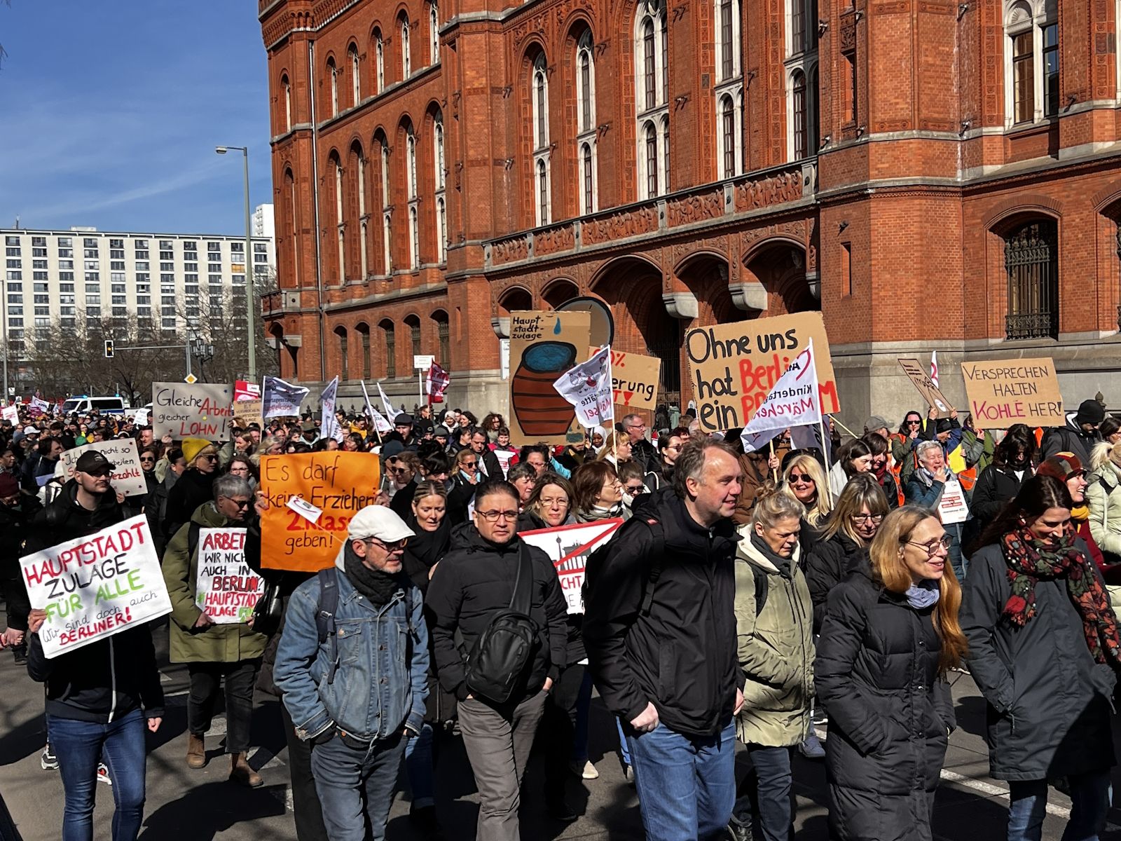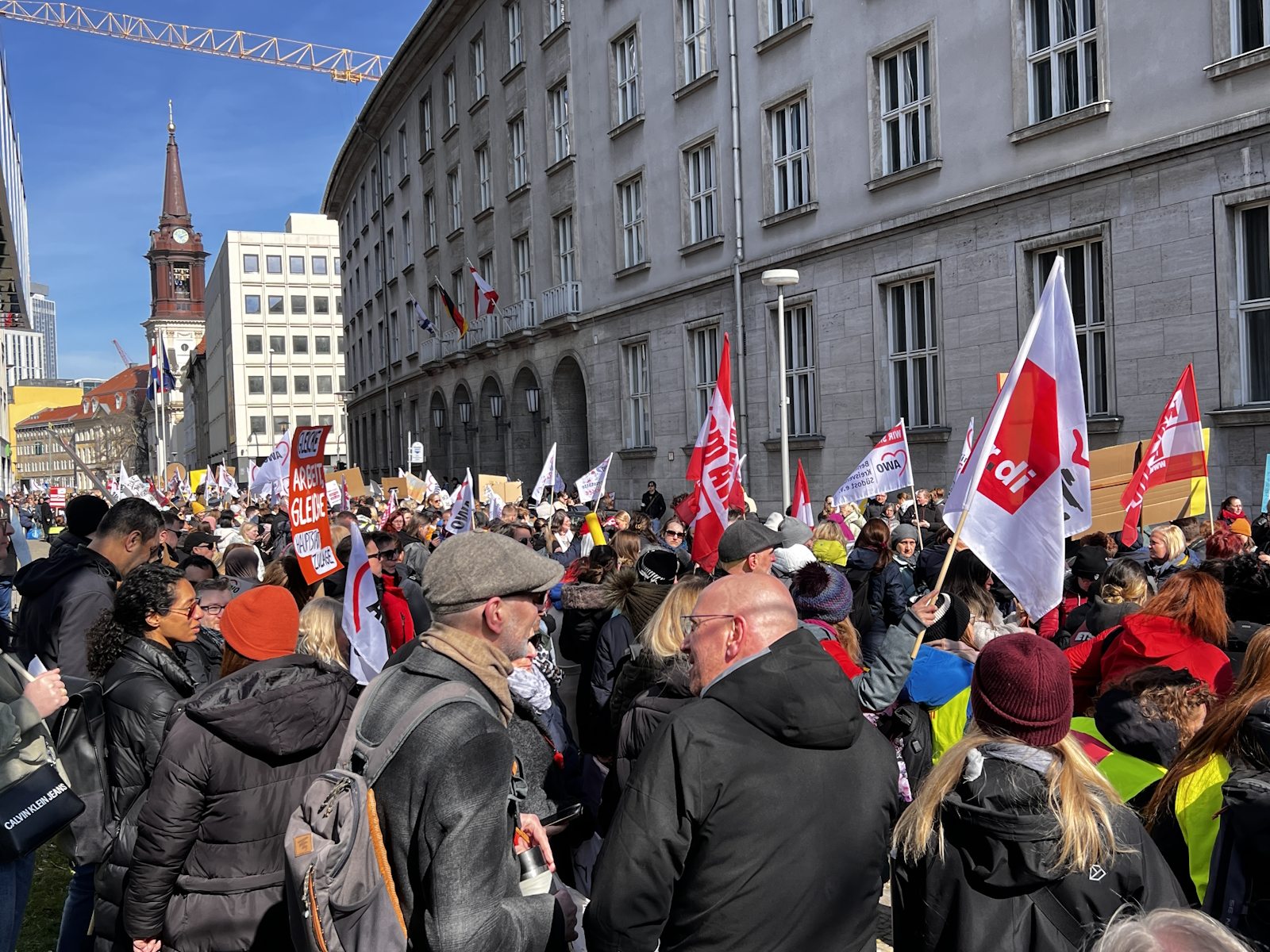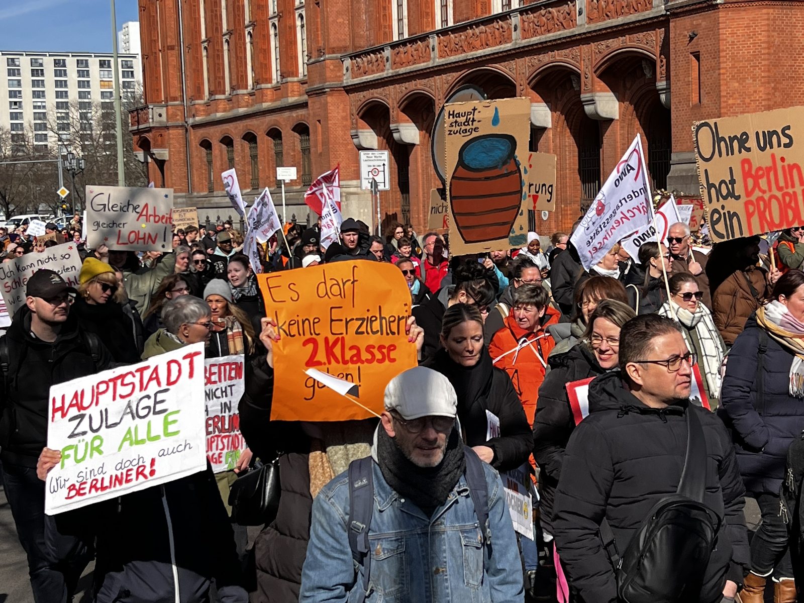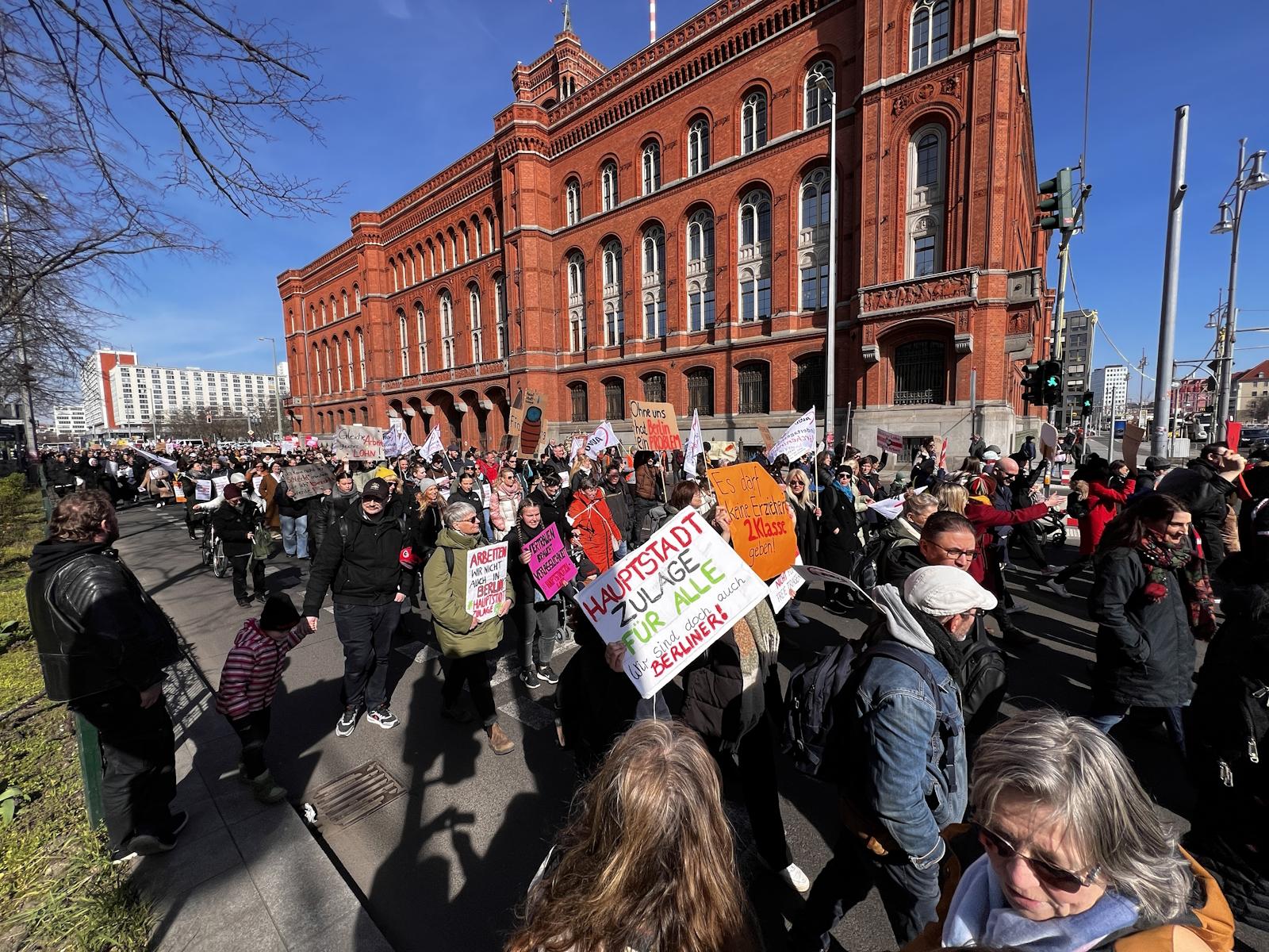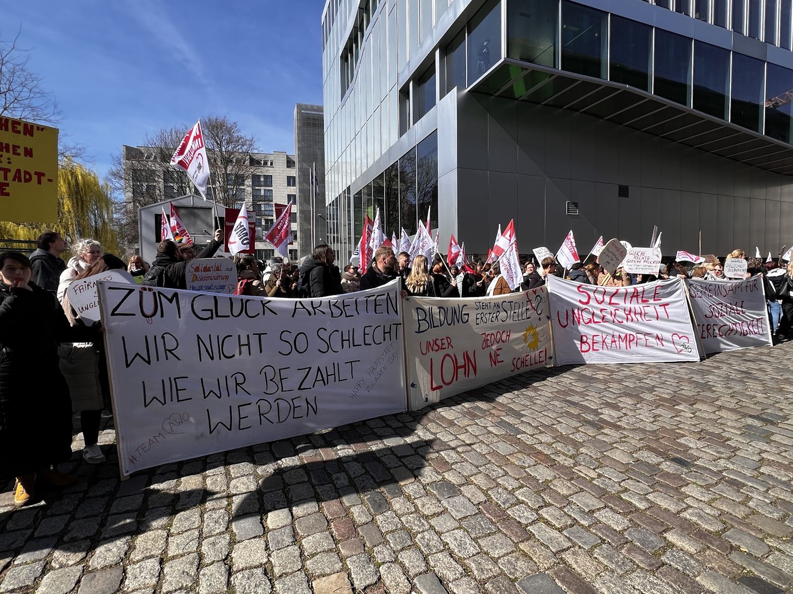 Nachdem bereits im Herbst vergangenen Jahres und am 7. März dafür demonstriert wurde, waren am 18. und 19. März 2024 die Einrichtungen der Berliner AWO, darunter u. a. Kitas, Beratungsstellen und Seniorenangebote geschlossen. Am 19. März protestierte die AWO mit einer Demonstration vor dem Roten Rathaus und der Senatsverwaltung für Finanzen gegen die Ungleichbehandlung der Mitarbeiter*innen freier Träger im Vergleich zu Landesbeschäftigten, insbesondere bei der Hauptstadtzulage.