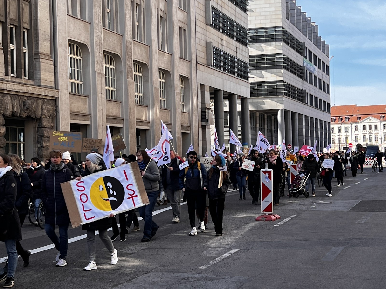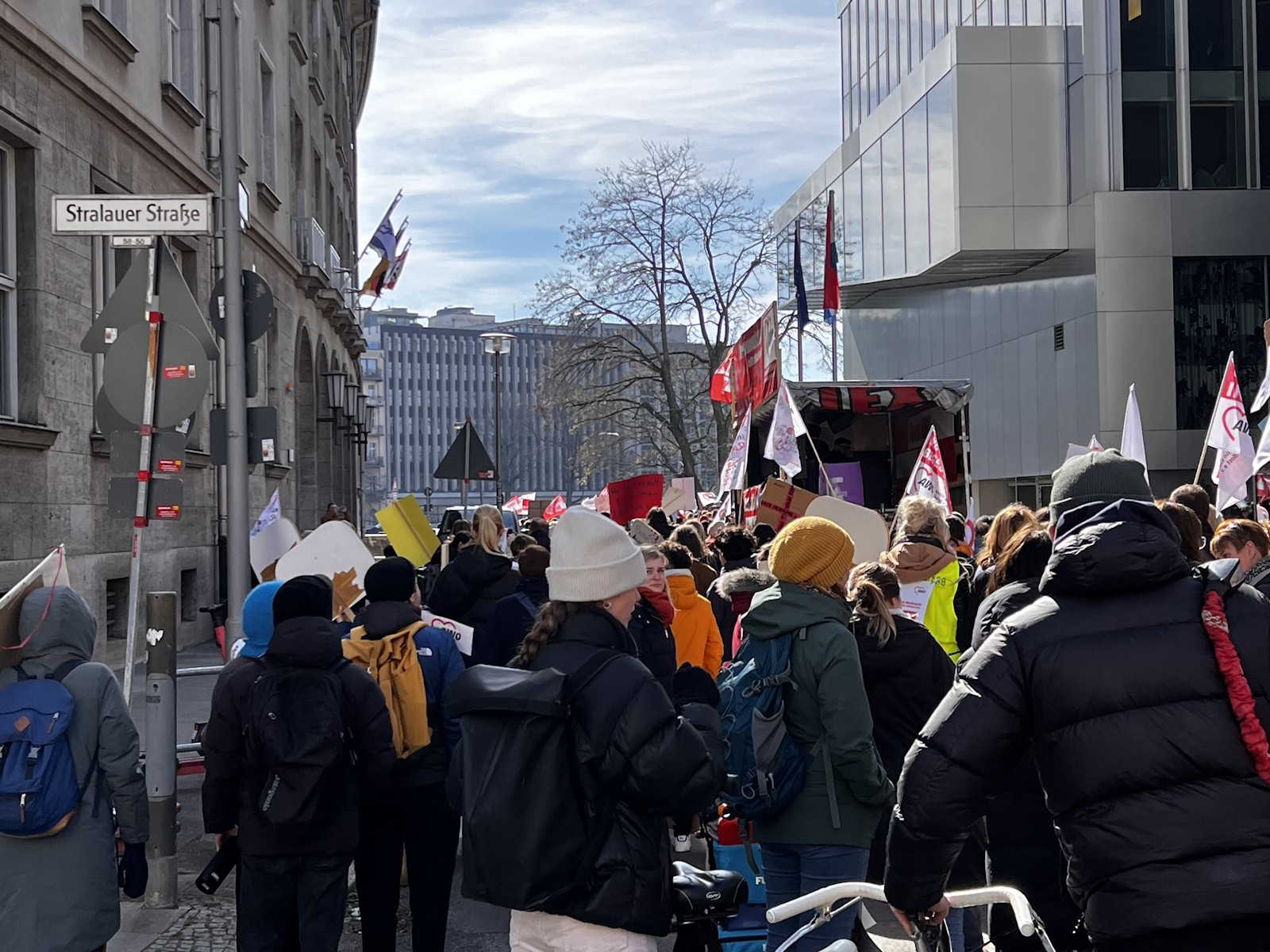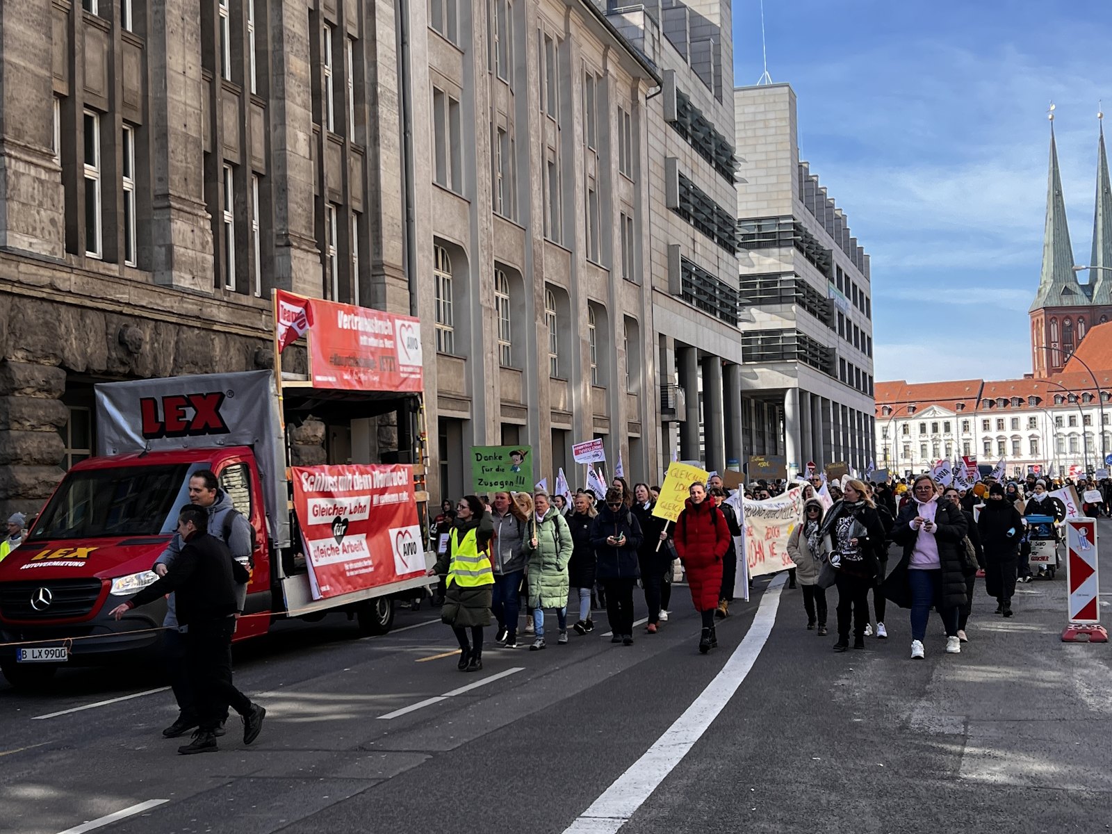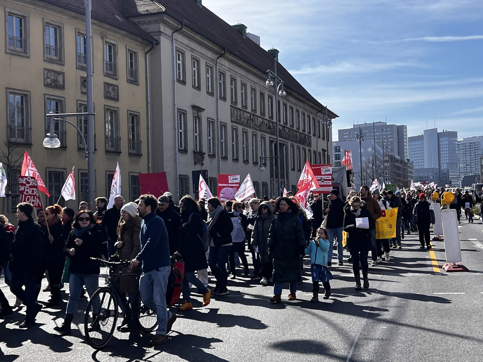 Auch die AWO Spree-Wuhle war dabei, mit den Mitarbeiter*innen der Kitas, der Schuldnerberatung, aus den Stadtteiltreffs, den Kinder- und Jugendeinrichtungen, der Notübernachtung … Gemeinsam mit allen Berliner Kolleg*innen erinnerten sie die Politik noch einmal deutlich daran, dass sie das Rückgrat der sozialen Versorgung in Berlin sind und keine Beschäftigten 2. Klasse sein wollen.