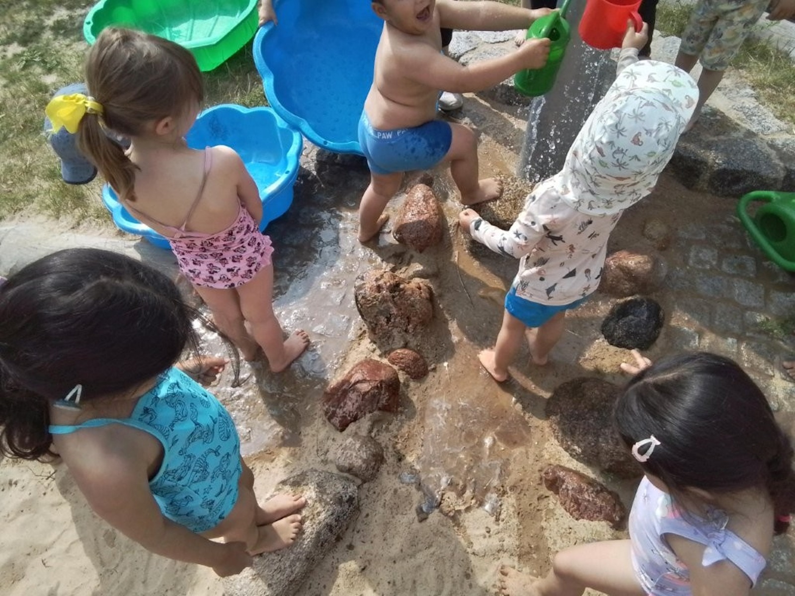 Ausgestattet mit Badebekleidung, Handtüchern und viel Neugier erlebten die Kinder einen ganzen Tag voller Wasserspaß. Mit Kannen, Eimern und weiteren Materialien wurde nach Herzenslust geplanscht, gematscht und experimentiert. Dabei konnten die Kinder spielerisch die Eigenschaften des Elements Wasser entdecken.