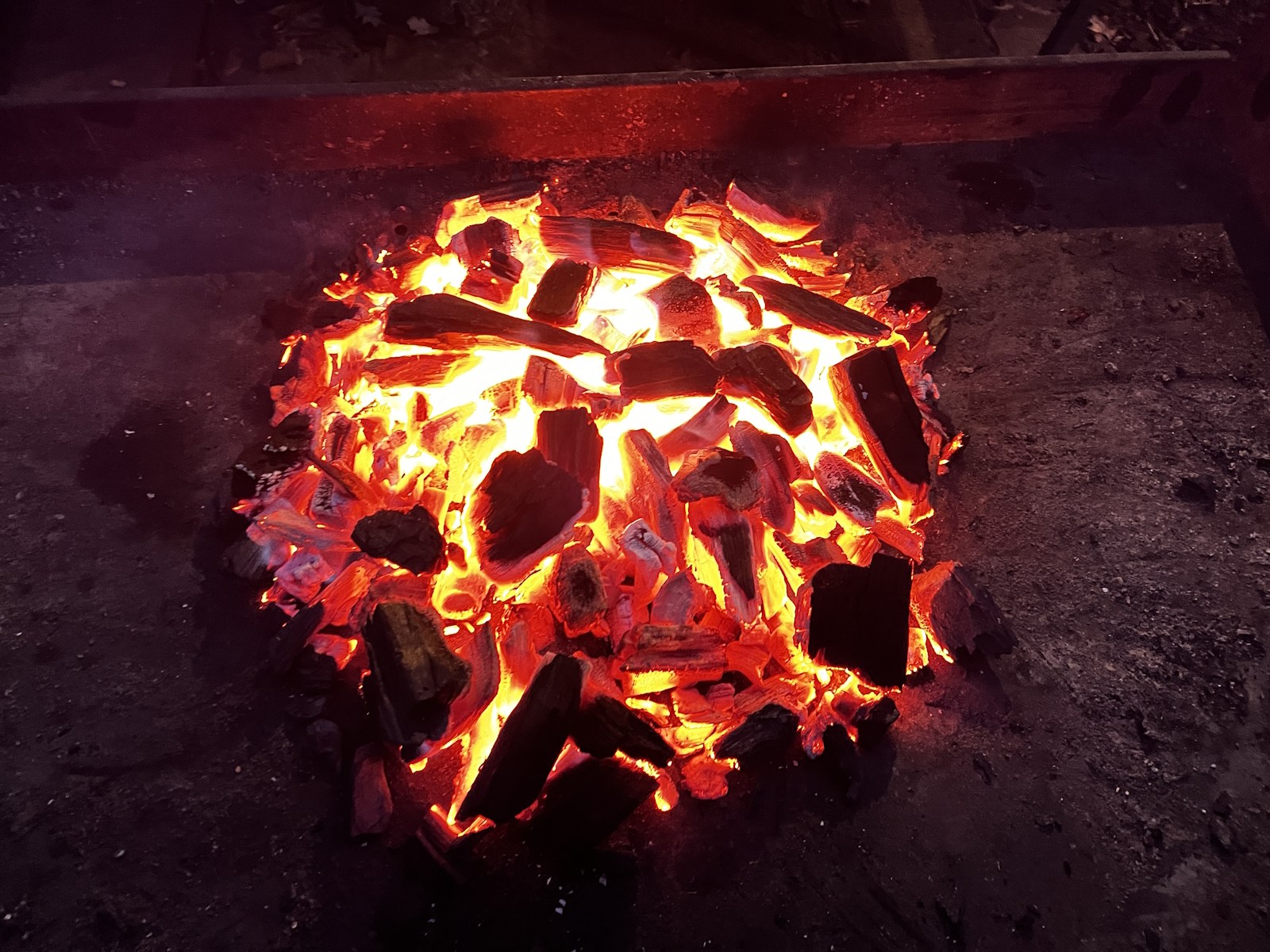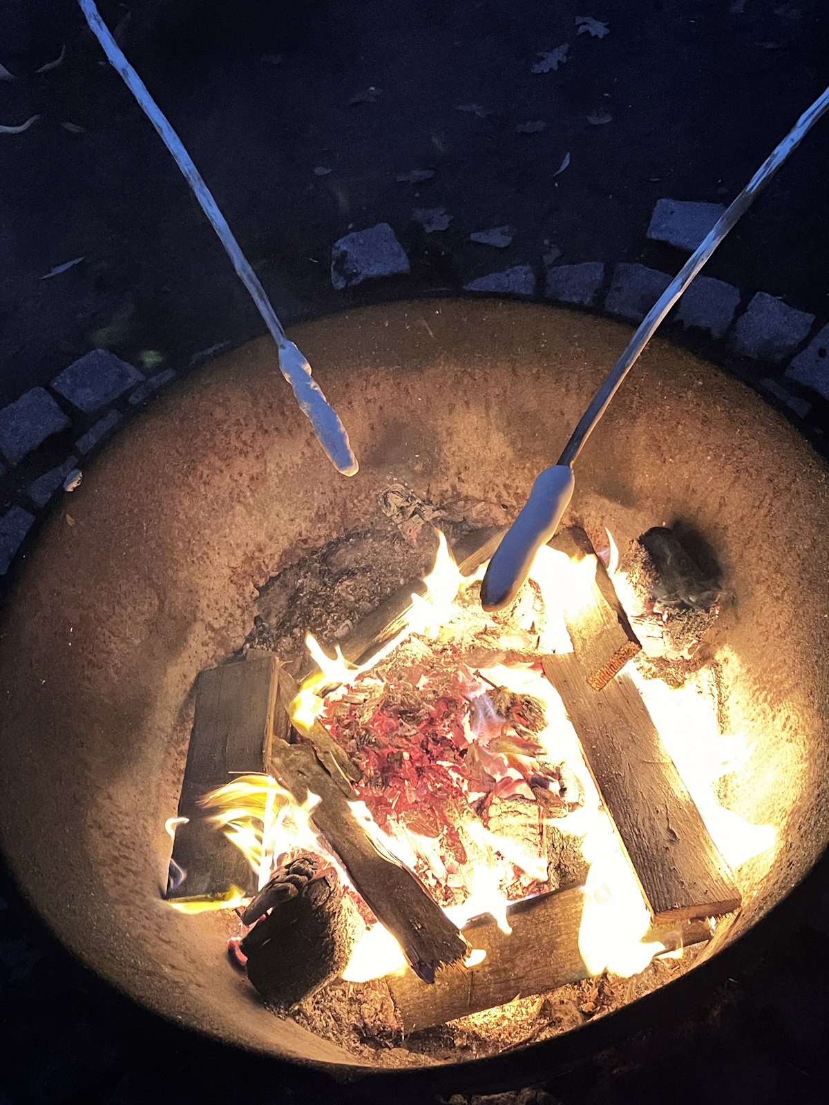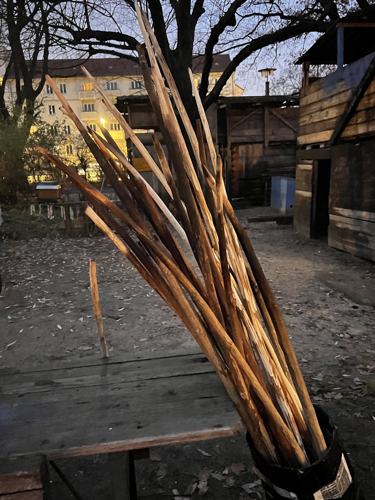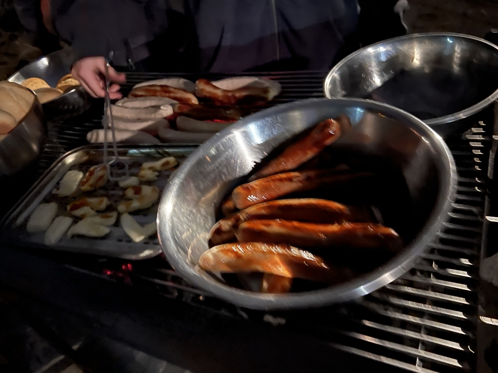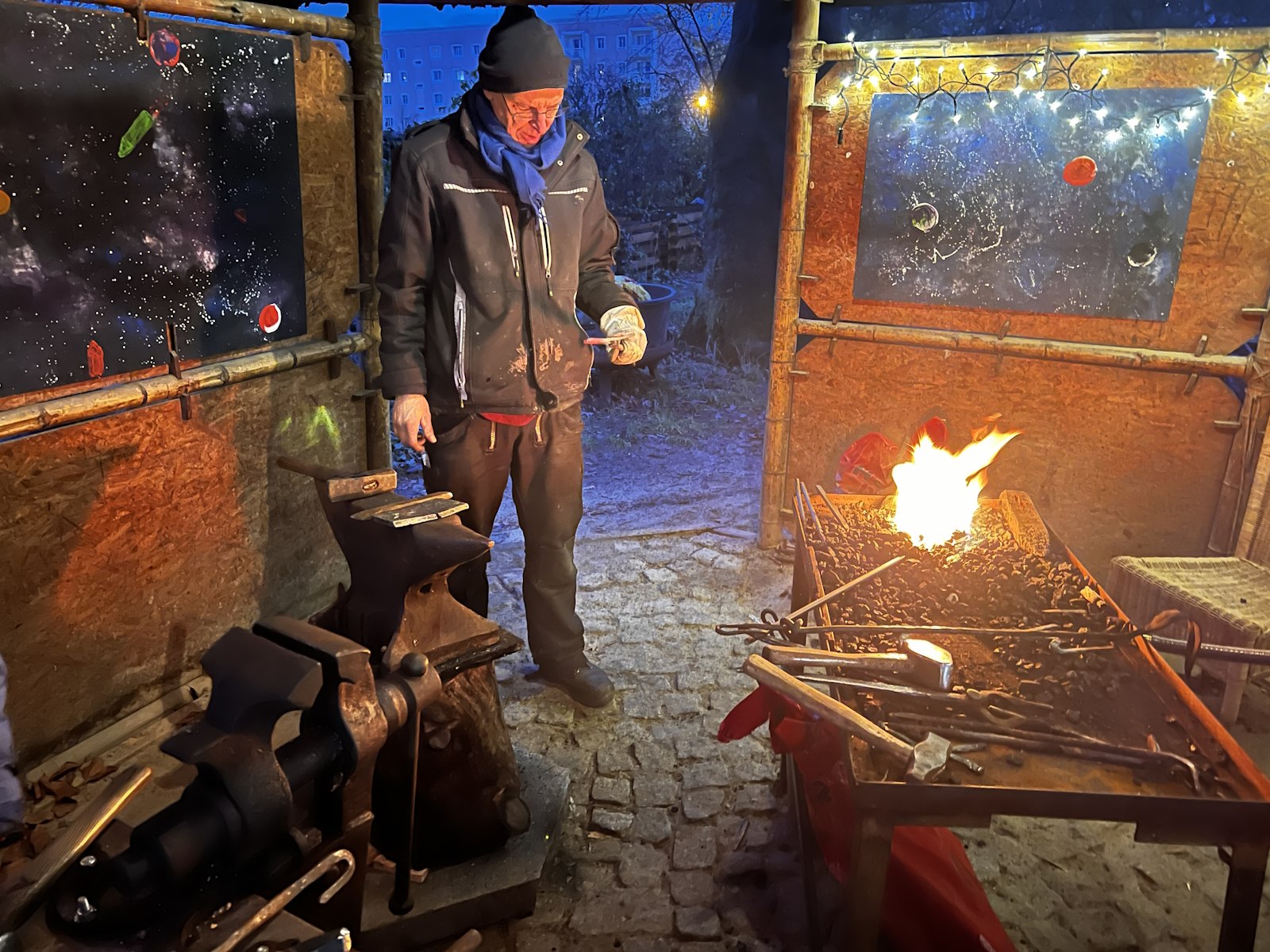 Weil die Schmiede unter das schützende Dach des Grillo gezogen war, musste dieser mit einem Zeltdach vorliebnehmen. Dort wurden wie immer Würstchen oder Halloumi gebraten und weil es ja der singende Grillo ist, war auch das eine oder andere Weihnachtlied zu hören. Im Kokon gab es zum Aufwärmen Punsch, Wärme spendete auch die Feuerschale an der Stockbrot gebacken wurde.