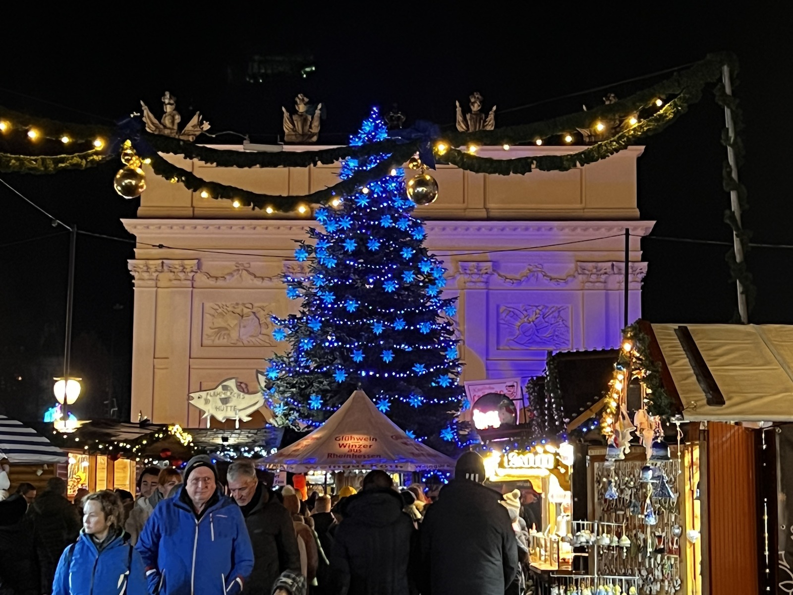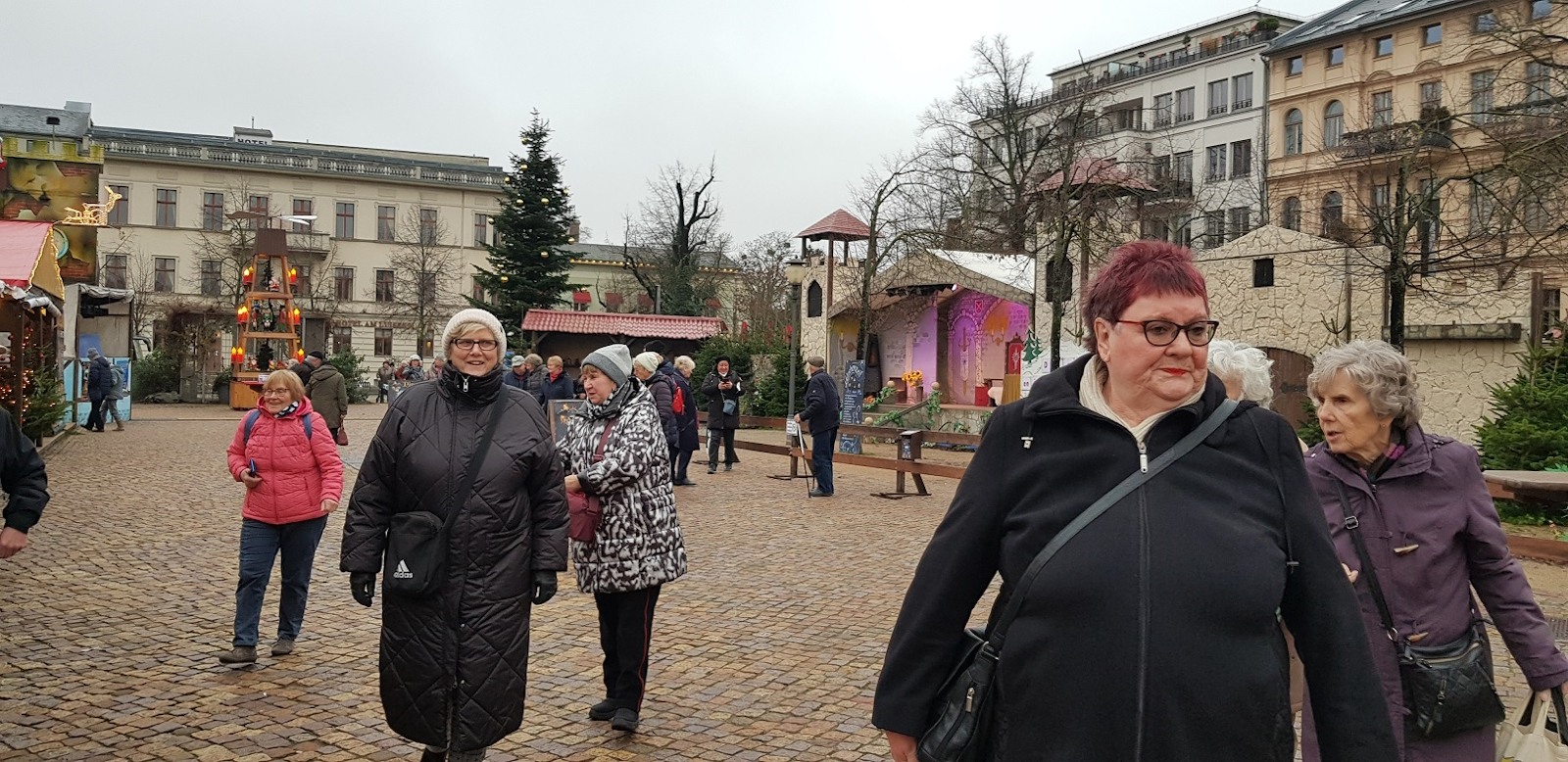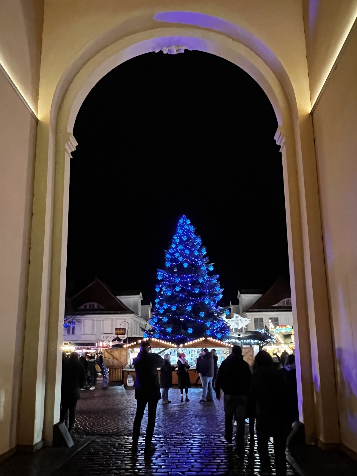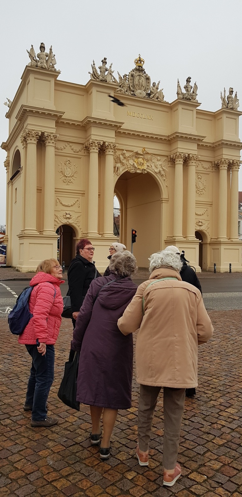 Vom Luisenplatz mit dem Brandenburger Tor erstreckt sich der Potsdamer Weihnachtsmarkt über die Brandenburger Straße bis zum Bassinplatz. Das Motto des Weihnachtsmarkts „Blauer Lichterglanz“ wird durch wunderschöne hellblaue Weihnachtsbäume vorm Brandenburger Tor und vor der Kirche St. Peter und Paul am Bassinplatz betont, die Anfang und Ende der Weihnachtsmeile bilden. Die Reisegruppe konnte individuell den Weihnachtsmarkt erkunden bevor im Wiener Café am Luisenplatz ein sehr leckeres Kaffeegedeck mit Torte nach Wahl wartete.