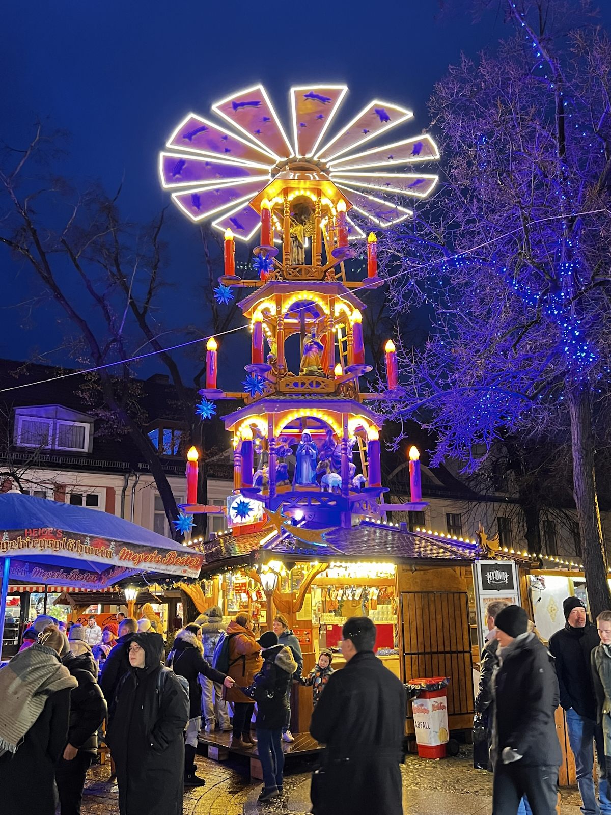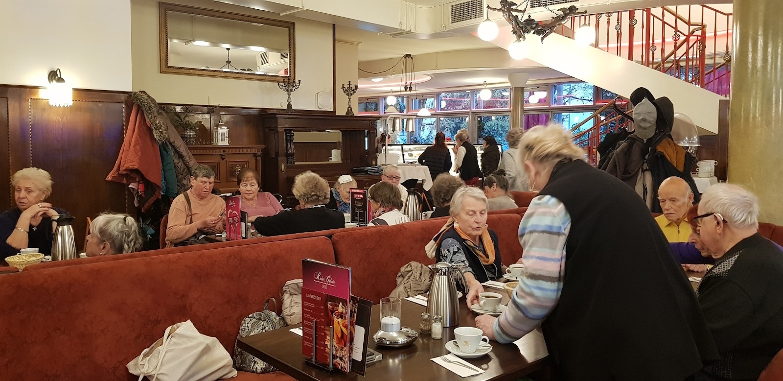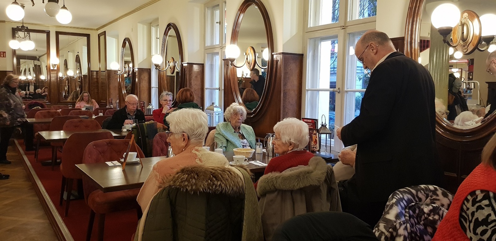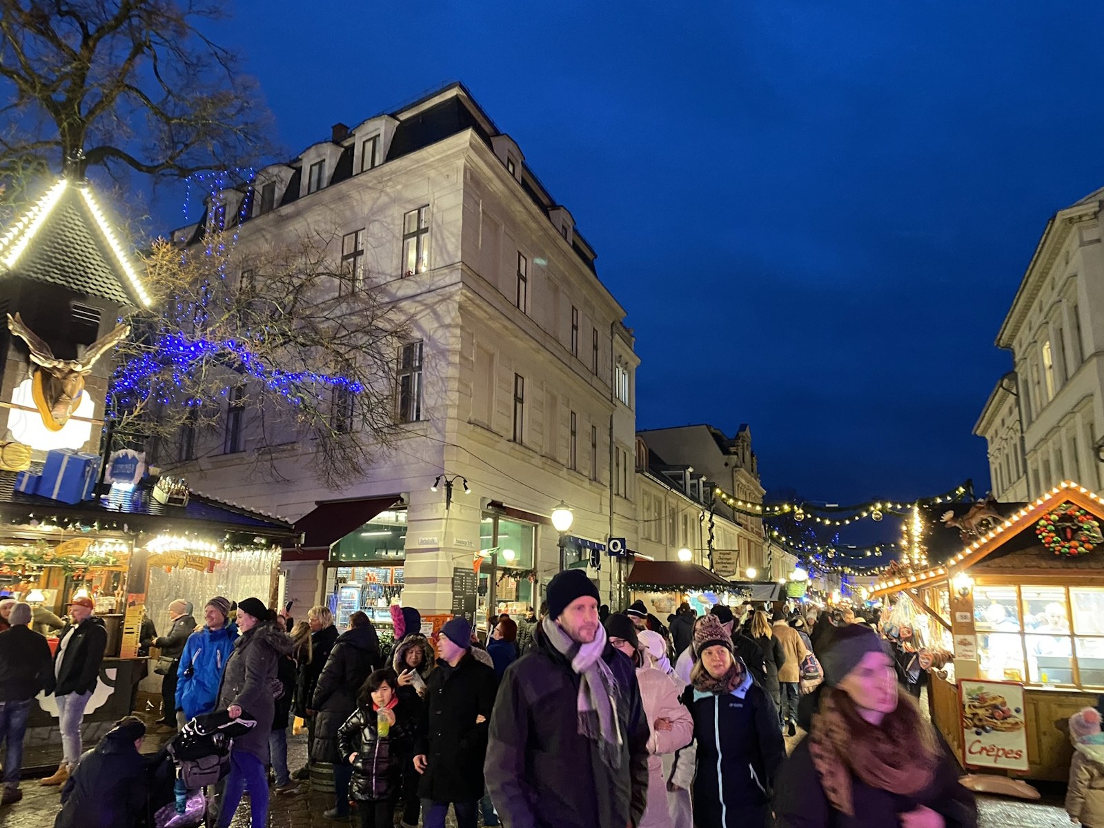 Vom Luisenplatz mit dem Brandenburger Tor erstreckt sich der Potsdamer Weihnachtsmarkt über die Brandenburger Straße bis zum Bassinplatz. Das Motto des Weihnachtsmarkts „Blauer Lichterglanz“ wird durch wunderschöne hellblaue Weihnachtsbäume vorm Brandenburger Tor und vor der Kirche St. Peter und Paul am Bassinplatz betont, die Anfang und Ende der Weihnachtsmeile bilden. Die Reisegruppe konnte individuell den Weihnachtsmarkt erkunden bevor im Wiener Café am Luisenplatz ein sehr leckeres Kaffeegedeck mit Torte nach Wahl wartete.