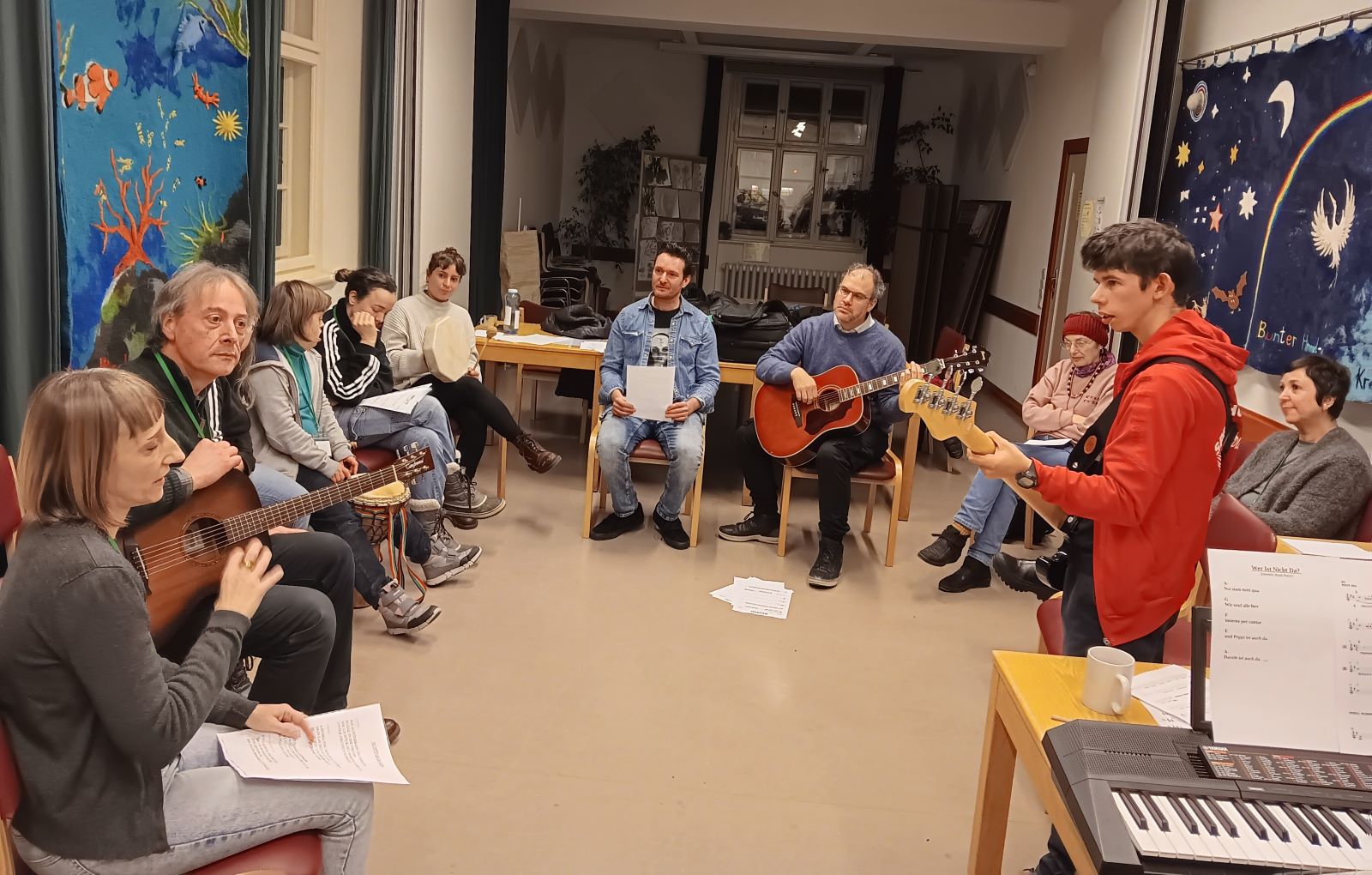 In einer Gruppe von Menschen unterschiedlichen Alters, mit unterschiedlichem kulturellem Hintergrund, mit oder ohne Beeinträchtigung, erarbeitet der Dirigent Texte, Melodien, Harmonien und beziehr die Teilnehmer in einer entspannten und lustigen Atmosphäre ein, um einen inklusiven Musikworkshop zu gestalten.